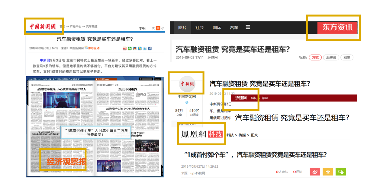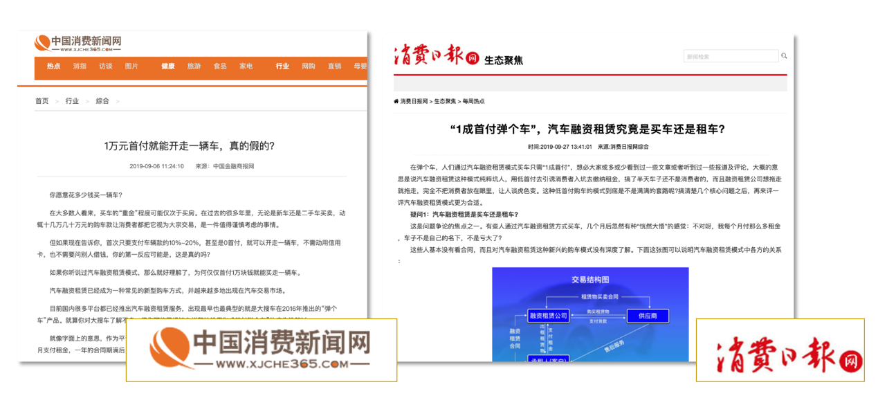 中國消費新聞網(wǎng)、消費日報網(wǎng)等權(quán)威維權(quán)類媒體,從汽車融資租賃大幅拉低了國內(nèi)年輕人購車門檻的特點,以及其與全款買車、貸款買車的不同角度,向廣大的消費者普及汽車融資租賃概念。
